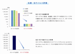 草津温泉の湯畑源泉では10秒でコロナウイルスが90%以上不活化することが知られていますが、GO-VCでも高濃度化でコロナウイルスの不活化作用が生じます。恐らくは草津温泉がPH値が1.6~2.1という、極めて酸性の高い泉質であることが高速殺菌に作用しているのではないでしょうか?