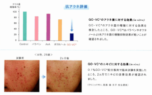 GO-VCは、アスコルビン酸(ビタミンC)にグリセリン(保湿成分)と脂肪族アルコールのオクタモール(抗菌成分)を結合させた両親媒性プロビタミンC(皮膚の中でビタミンCに変換される)です。
