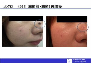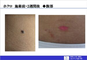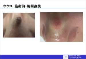 出来物の皮膚組織の深さに応じて出来物の周囲の健常皮膚を削る範囲が異なりますが、いずれにしても多くの場合は一回り以上大きく蒸散させます。
