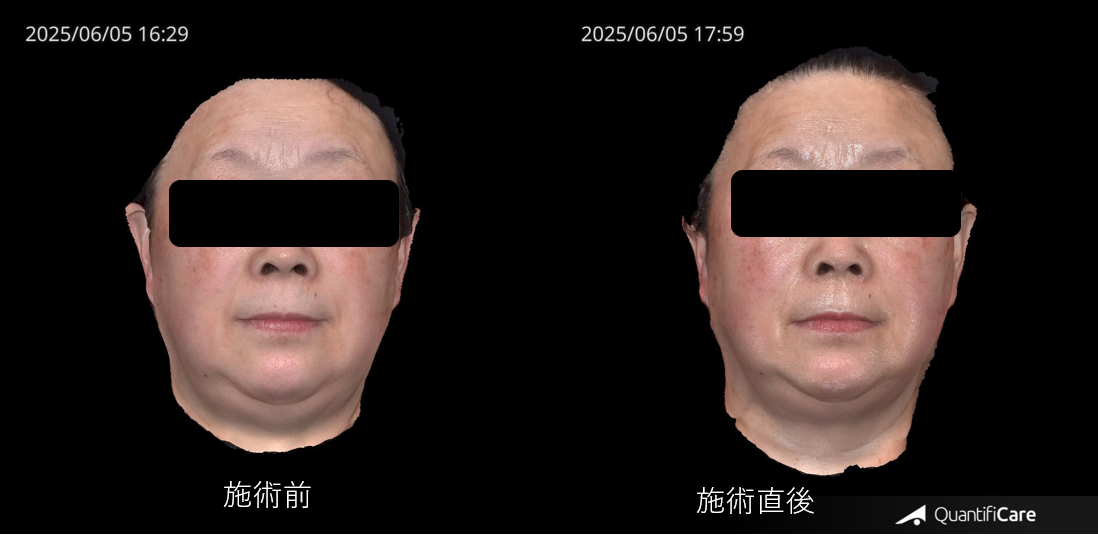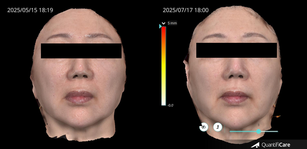 脂肪層の厚みを考慮し、顎下〜下顔面の照射時には出力を高めたディープタイトニングモードを使用。 脂肪の収縮を促しながら、フェイスラインのもたつきを改善し、全体の輪郭バランスを整えました。 |