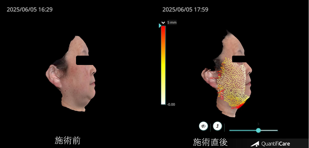 全顔〜顎下にサーマジェンEVOを500ショット照射。 さらに、脂肪層をより深く引き締めるためにディープタイトニング50ショット(+11,000円)を追加し、頬および顎下のボリュームコントロールを目的として出力を調整しながら照射。 加えて、リフトアップ効果を高めるためにHIFU(4.5mm)オプション30ショット(+16,500円)を併用しました。 |