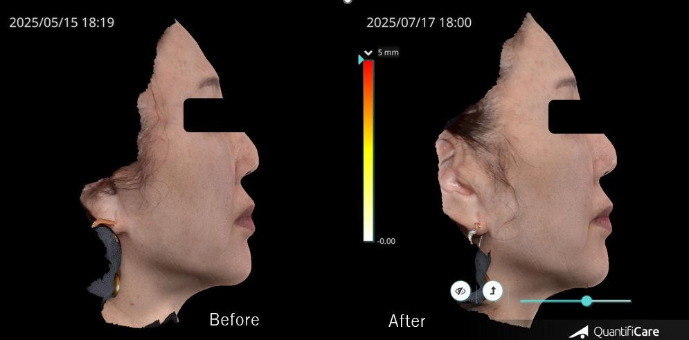 ・顎下の脂肪ボリュームが明らかに減少 ・フェイスラインが引き締まり、横顔の印象が軽やかに・頬の余分なボリュームも自然にコントロールされ、下顔面全体のラインがすっきり |
