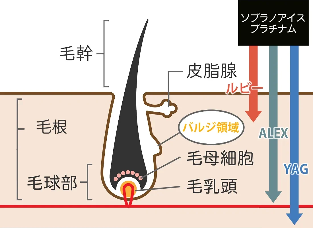 ソプラノアイスプラチナムは、毛を作り出す指令を出す「バルジ領域」に熱を蓄積させて脱毛する蓄熱式医療脱毛です。